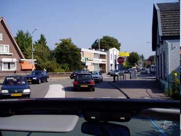| Hier rijden we de stationsstraat in. Links zie je 'De Dorpskamer' met een gezellig terras. |